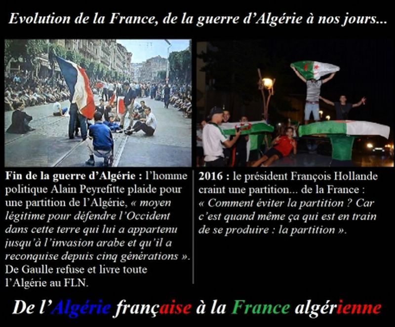En 1962, " l'entre l'enfer et la raison " de Camus, s'est traduit " entre la valise ou le cercueil ". Dans très peu d'années cela se traduira " entre l'exode ou la dhimmitude ", par la faute de gouvernants aussi criminels et lâches que ceux de 1939 et ceux de 1962.