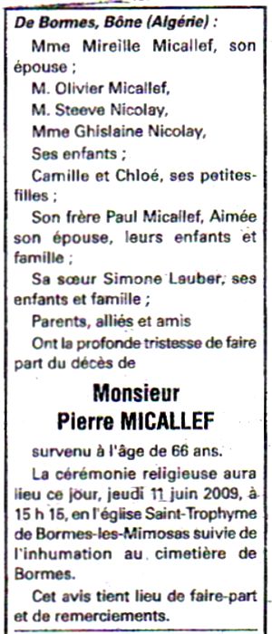 M. Jean Paul Selles nous fait part du décés de M. Pierre Micallef et nous joint ci-dessous l'encart mortuaire