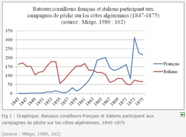 12 Le 13 juin 1862, une convention sur la navigation fut signée entre le ministre des Affaires étrangères français Edouard Thouvenel et le jeune royaume italien. Ce dernier obtint du Quai d'Orsay un régime de faveur lui permettant de conserver sa prédominance sur la pêche et la transformation du corail (18).