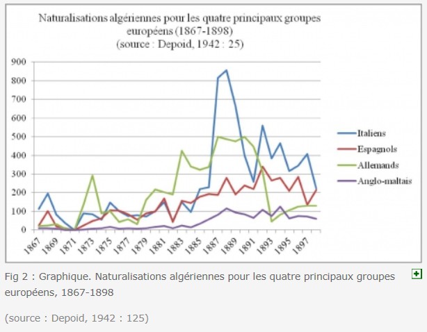 2 Ni nationaux de la puissance coloniale, ni colonisés, ces " étrangers blancs " (Singaravélou, 2013 : 126) ont formé une sorte d'entre-deux que la France a cherché tant bien que mal à assimiler (Noiriel, 2007 : 89). En Algérie, les grandes lignes de la politique d'assimilation menée à l'égard des étrangers peuvent se lire à travers deux mesures phares : la simplification de la procédure de naturalisation par le sénatus-consulte du 14 juillet 1865 et l'application de la loi métropolitaine du 26 juin 1889 qui réintroduit le jus solis (Blévis, 2012). Pour les historiens qui se sont intéressés aux populations européennes de l'Algérie, cette politique d'ouverture de la nationalité a été guidée par des considérations d'ordre démographique (2). L'objectif était de renverser le déséquilibre entre une population française peu nombreuse et une population étrangère qui ne cessait de croître, cela afin d'éviter un risque " autonomiste latent " (Blévis, 2012 : 217).