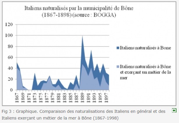 L'histoire de la colonisation maritime de l'Algérie au XIXe siècle met en évidence la dialectique permanente à laquelle est confrontée la puissance coloniale française face au monopole italien dans le domaine de la pêche et de la navigation. Auxiliaires de la conquête militaire et piliers de l'industrie halieutique, les marins-pêcheurs italiens sont alors considérés comme des éléments indispensables au peuplement des villes portuaires comme Bône. A partir des années 1860, la mise en correspondance du sol et du privilège national, censée favoriser leur naturalisation et leur sédentarisation, contribue surtout au développement d'un trafic d'identité pour contourner des règlements de plus en plus restrictifs. Accusés de monnayer leur naturalisation en échange de promesses de vote, les pêcheurs naturalisés se retrouvent au cœur de la crise politique qui frappe l'Algérie à la fin du XIXe siècle et voient leur statut de citoyen reconsidéré.